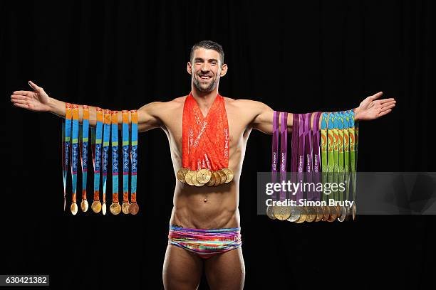 NEW YORK, NY - AUGUST 29: U.S. Olympic swimmer Michael Phelps is photographed for Sports Illustrated with his Olympic medals, 28 in all, 23 gold, on August 29, 2016 in New York City. PUBLISHED IMAGE. CREDIT MUST READ: Simon Bruty/Sports Illustrated via Contour RA. (Photo Simon Bruty/Sports Illustrated via Contour RA by Getty Images)